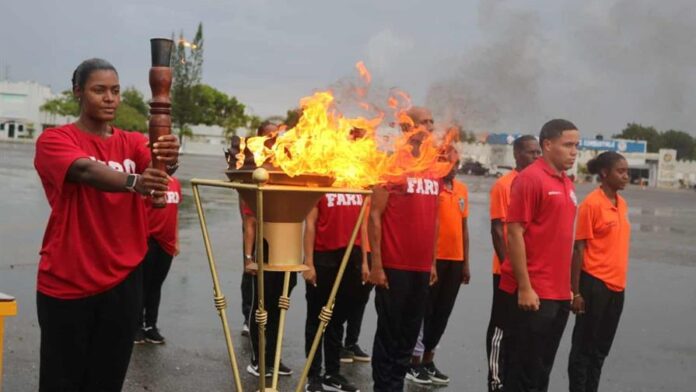 En este mismo orden se procedió al encendido del fuego deportivo que estuvo a cargo de la cabo Santa Cotes Villa, FARD., que fue escoltada por atletas de las cuatro instituciones participantes.