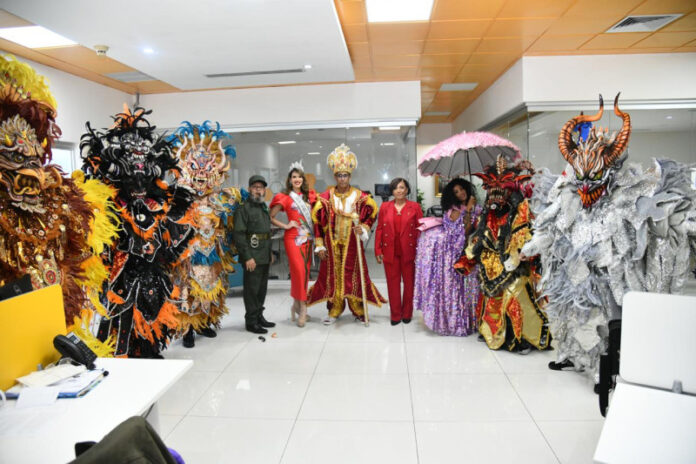 La alcaldesa de La Vega, Amparo Custodio visitó las instalaciones del LISTÍN DIARIO junto a la reina del Carnaval Vegano, Kiara Ortiz, el Rey Momo, Ramón Salcedo, alias “Chanina”, una comitiva de coloridos diablos cojuelos y otros personajes insignia de esta festividad.